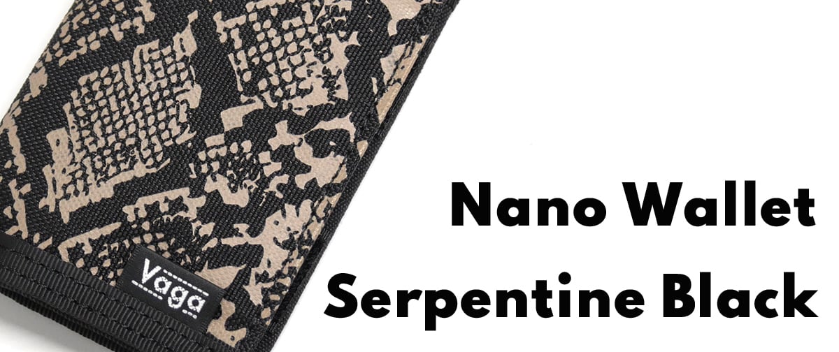 "Nano Wallet"は、極限まで小型化された財布です。 ポケットに入れていても身体の動きを妨げない超小型サイズでありながら、カード、紙幣、コインを分別して収納することができます。 こちらは2026 SSシーズナルカラーとなるSerpentine Blackです。 ポリエステルオックスフォード生地にシルクスクリーンプリントでスネークスキンが表現されています。 An extremely miniaturized tri-fold wallet, which can hold bills, coins, and cards separately. To make it minimal when tri-folded with contents inside, this wallet is precisely dimensioned and suitable fabrics are adapted for each part. Vaga's long seller items since 2014. Dimension: W:11cm x H:7cm